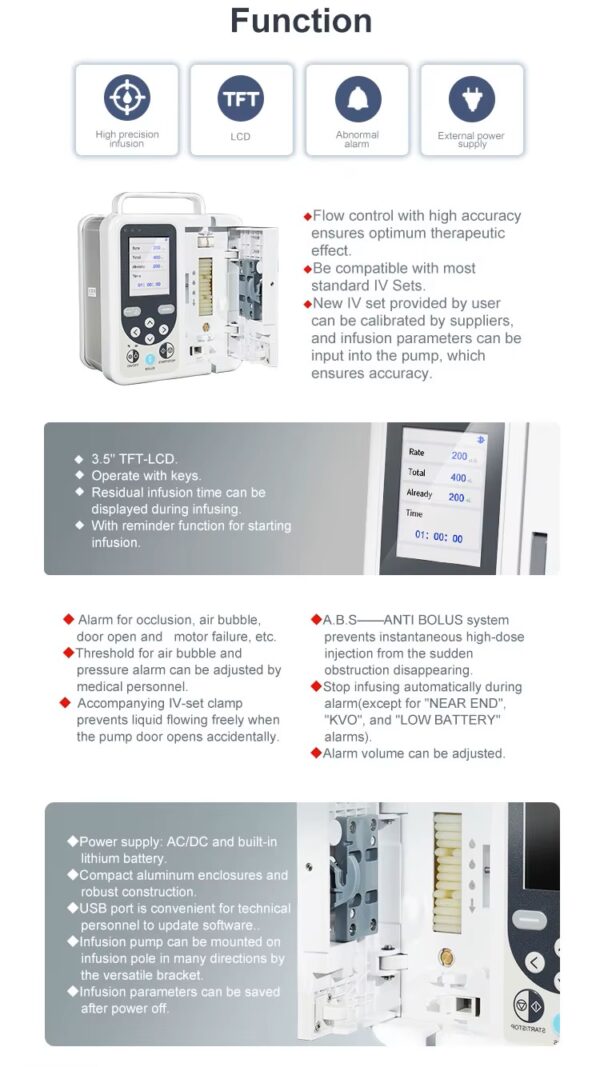 • The product is a volumetric infusion pump, featuring high safety, easy operation, and long life